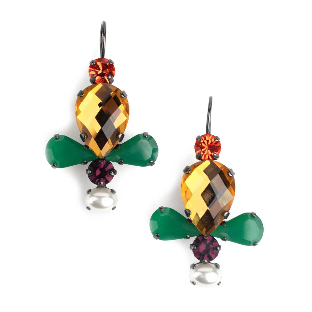 Brass earrings with black plating, pearls and crystals