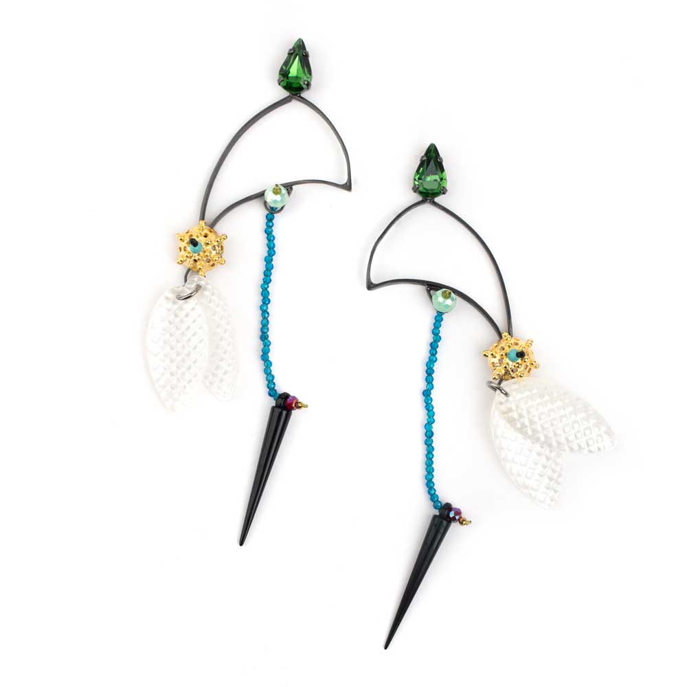 Σκουλαρίκια Ψάρια από ορείχαλκο με μαύρη και χρυσή επιμετάλλωση και κρύσταλλα